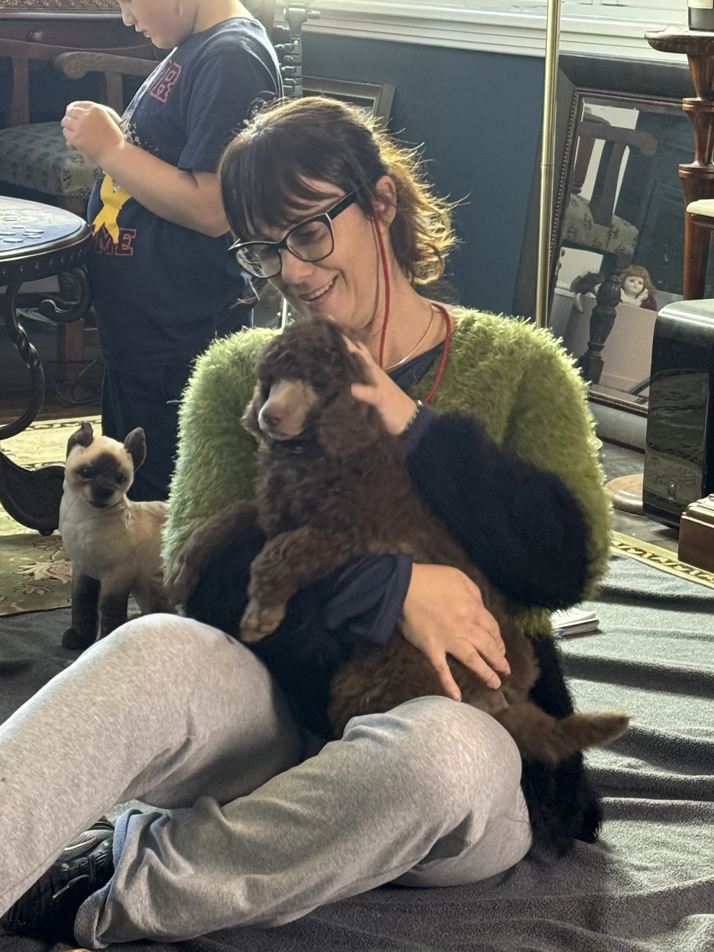 During their time with us, puppies are introduced to different people who we have visit them. Strict hygiene practices are put in place and pups are introduced to people with hats, sunglasses, beards, and children. As the puppies get older, we have “Puppy Parties” where we invite selected people to participate in some training with them.